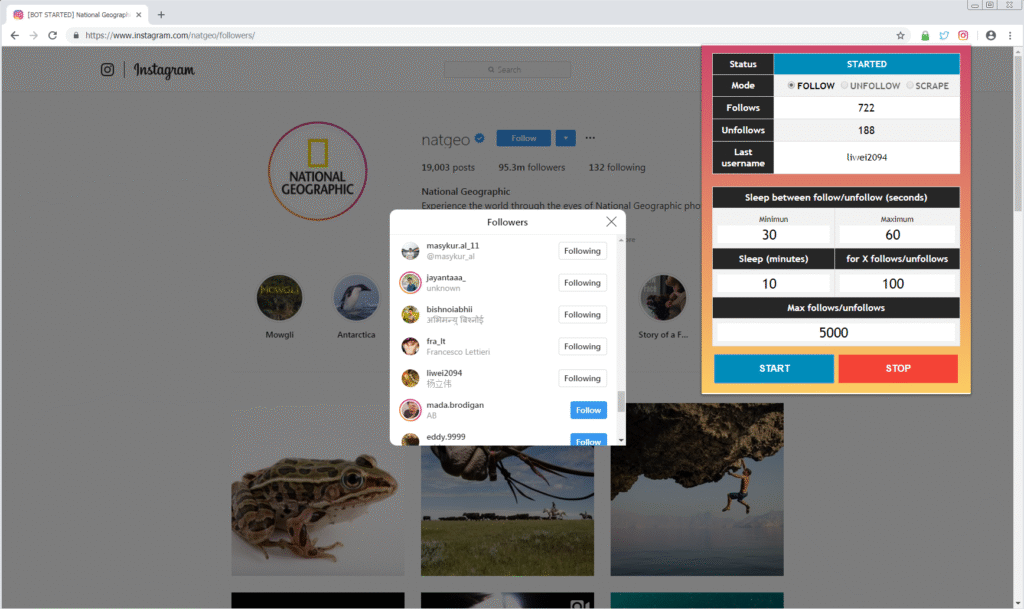 • The Chrome extension “Instagram Auto Follow/Unfollow/Scraper” (sources: obfuscated javascript + html + css + png images)